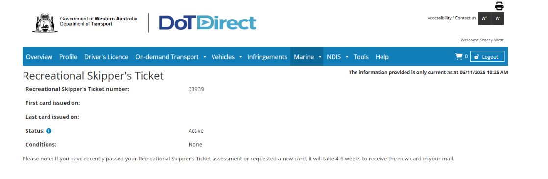 Once logged in to DoTDirect, use the top navigation bar to navigate to the 'Recreational Skipper’s Ticket' page, which can be found under the 'Marine' drop down.